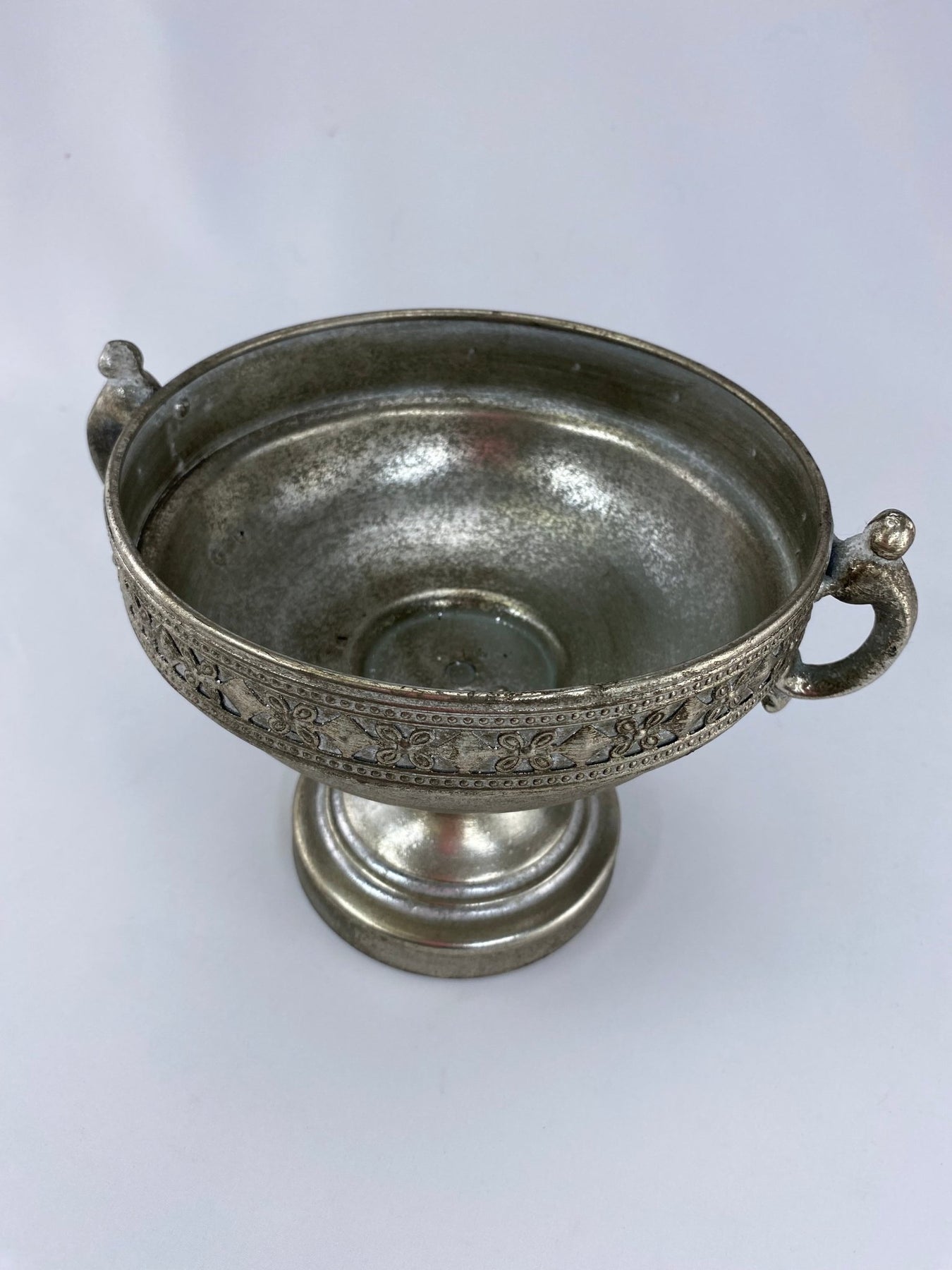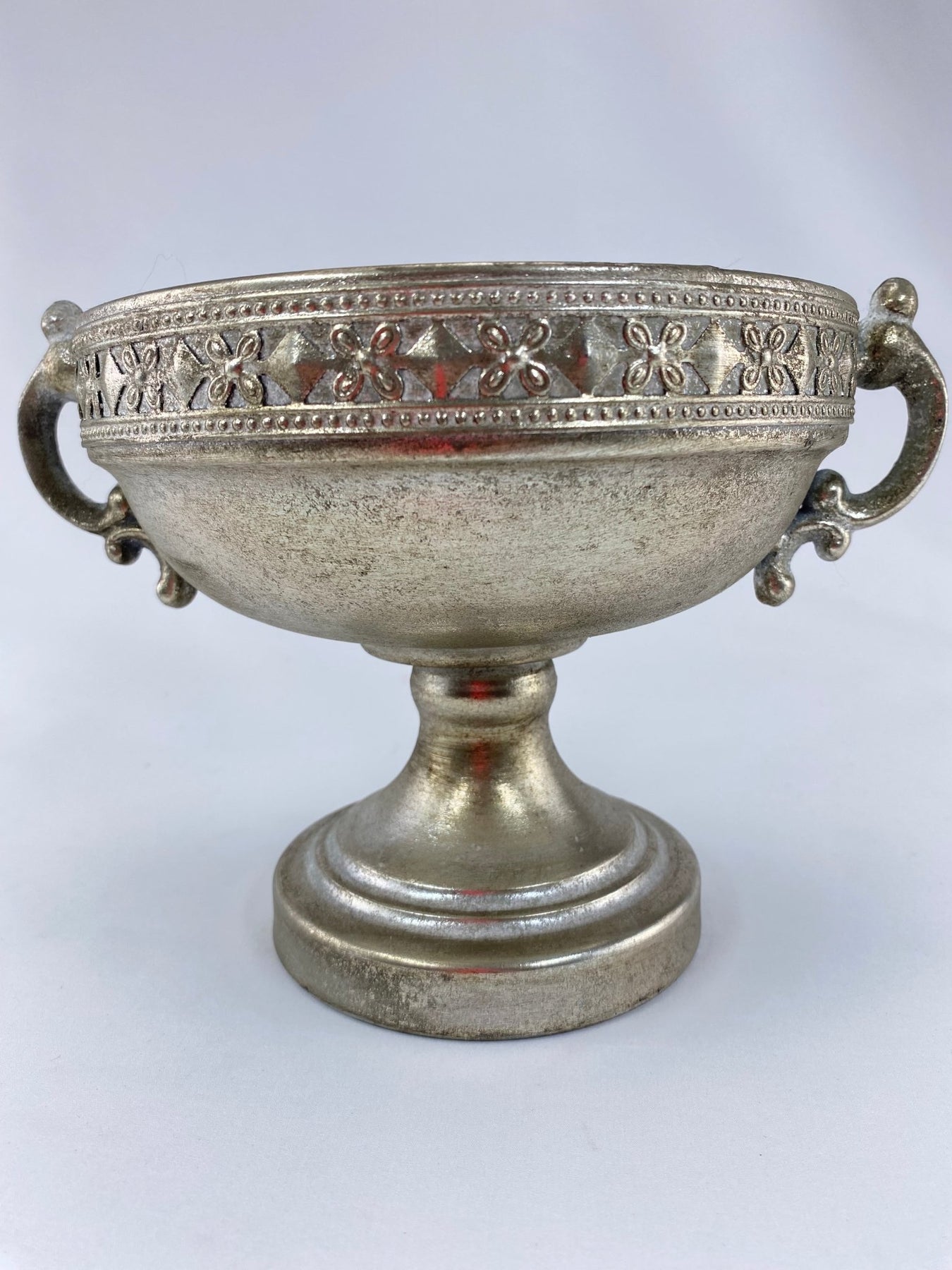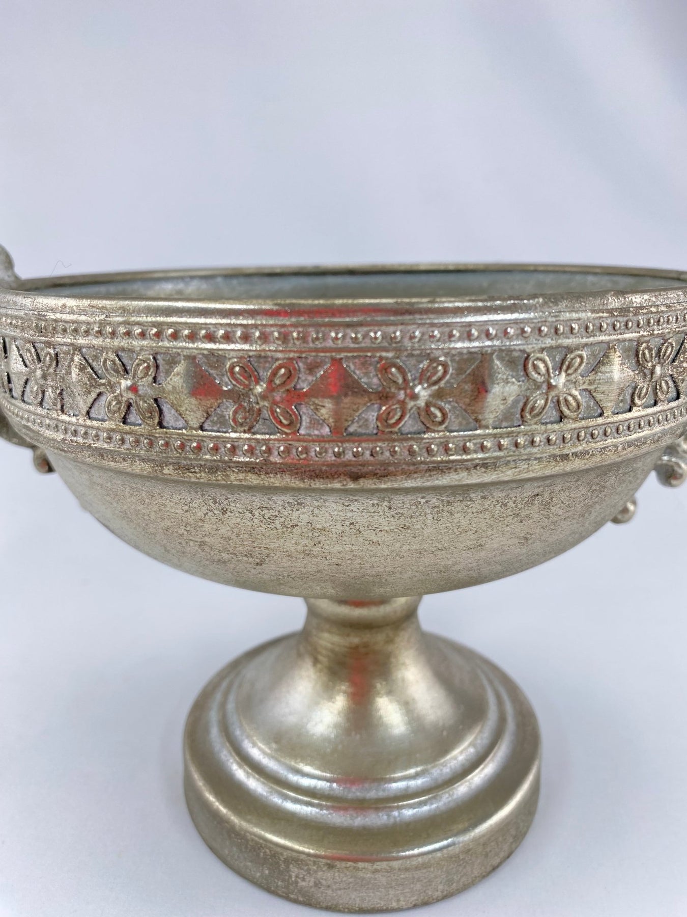 Metal pedestal container for floral designing with floral design embossed. Silver metal