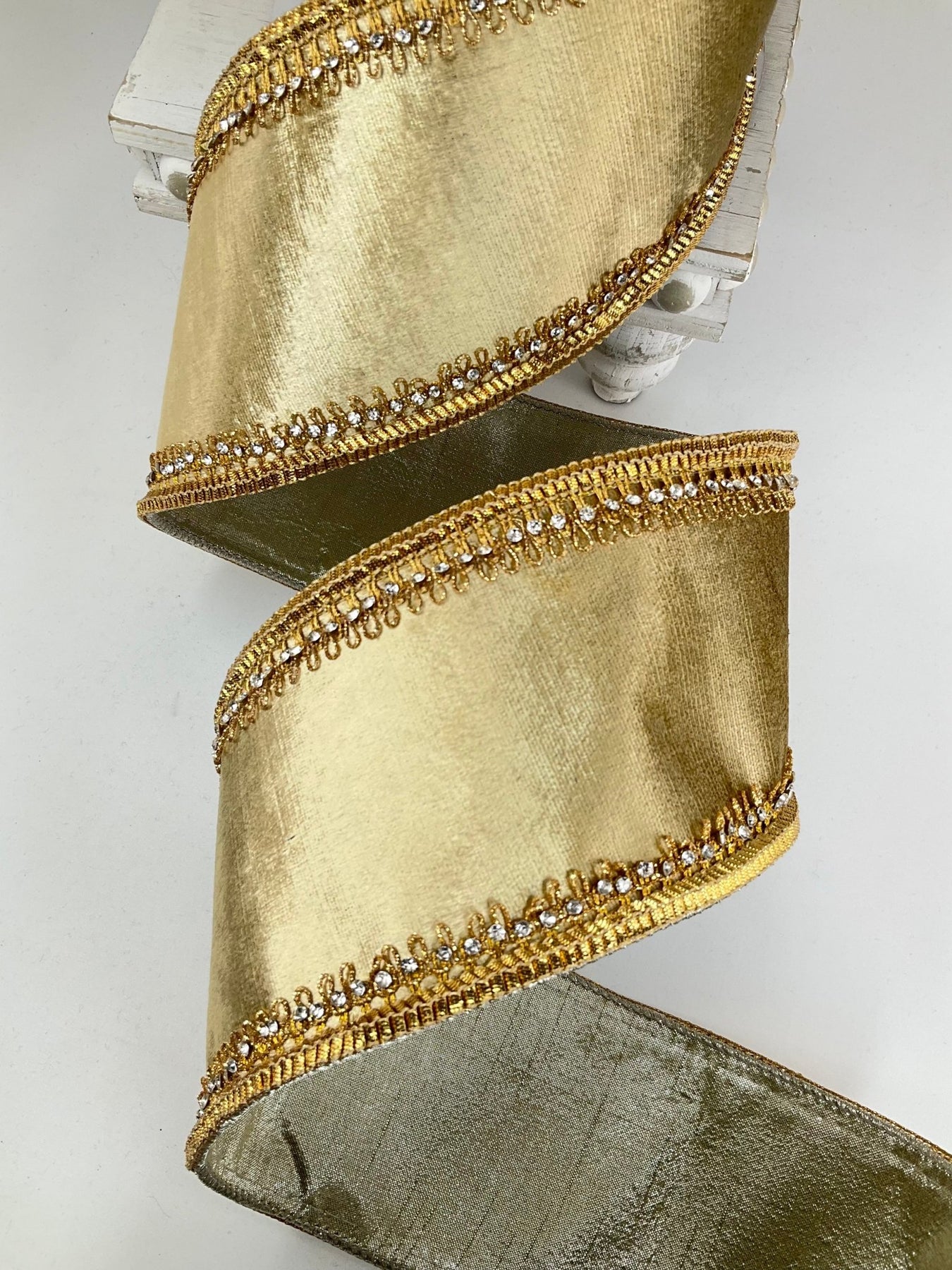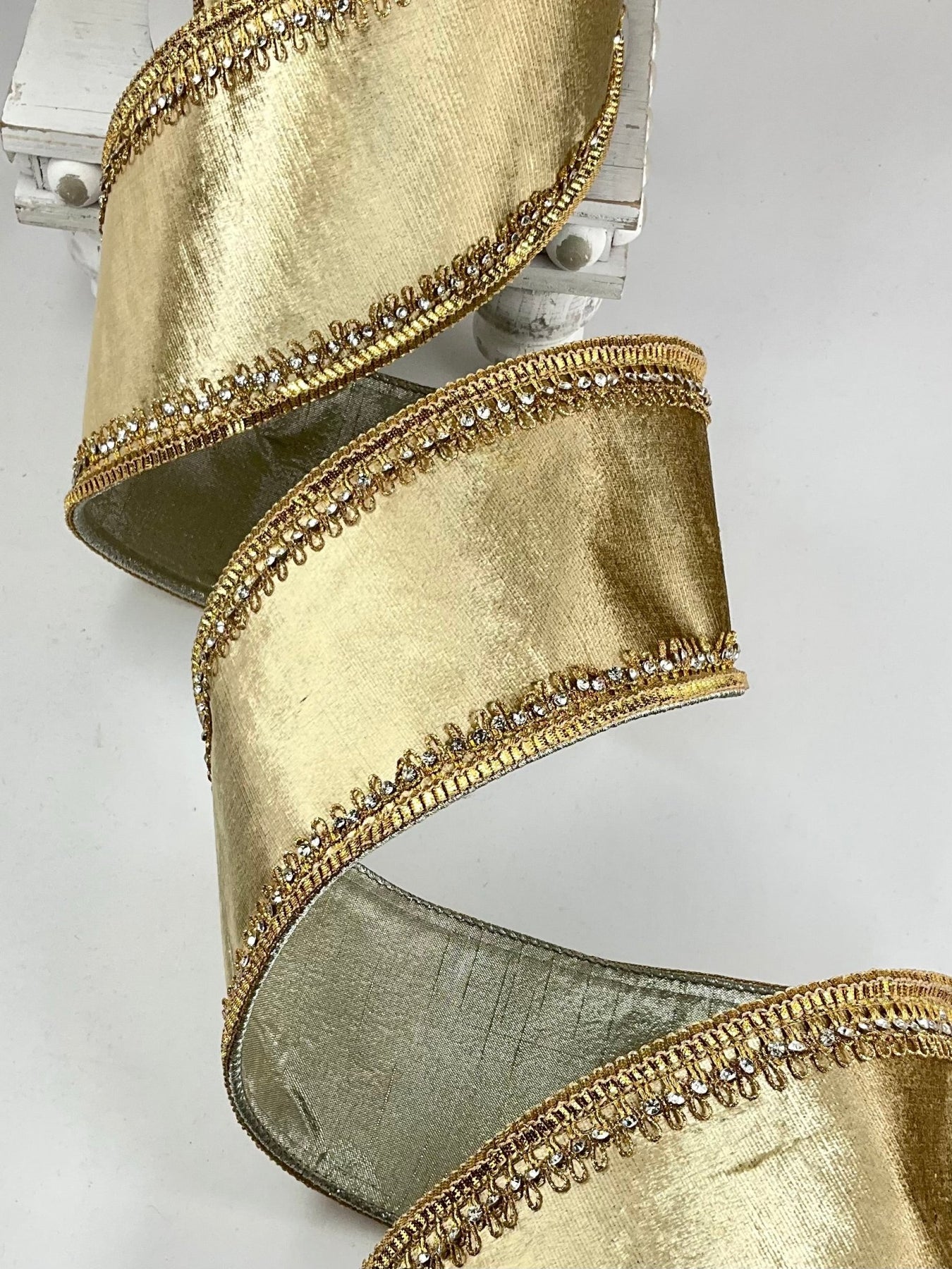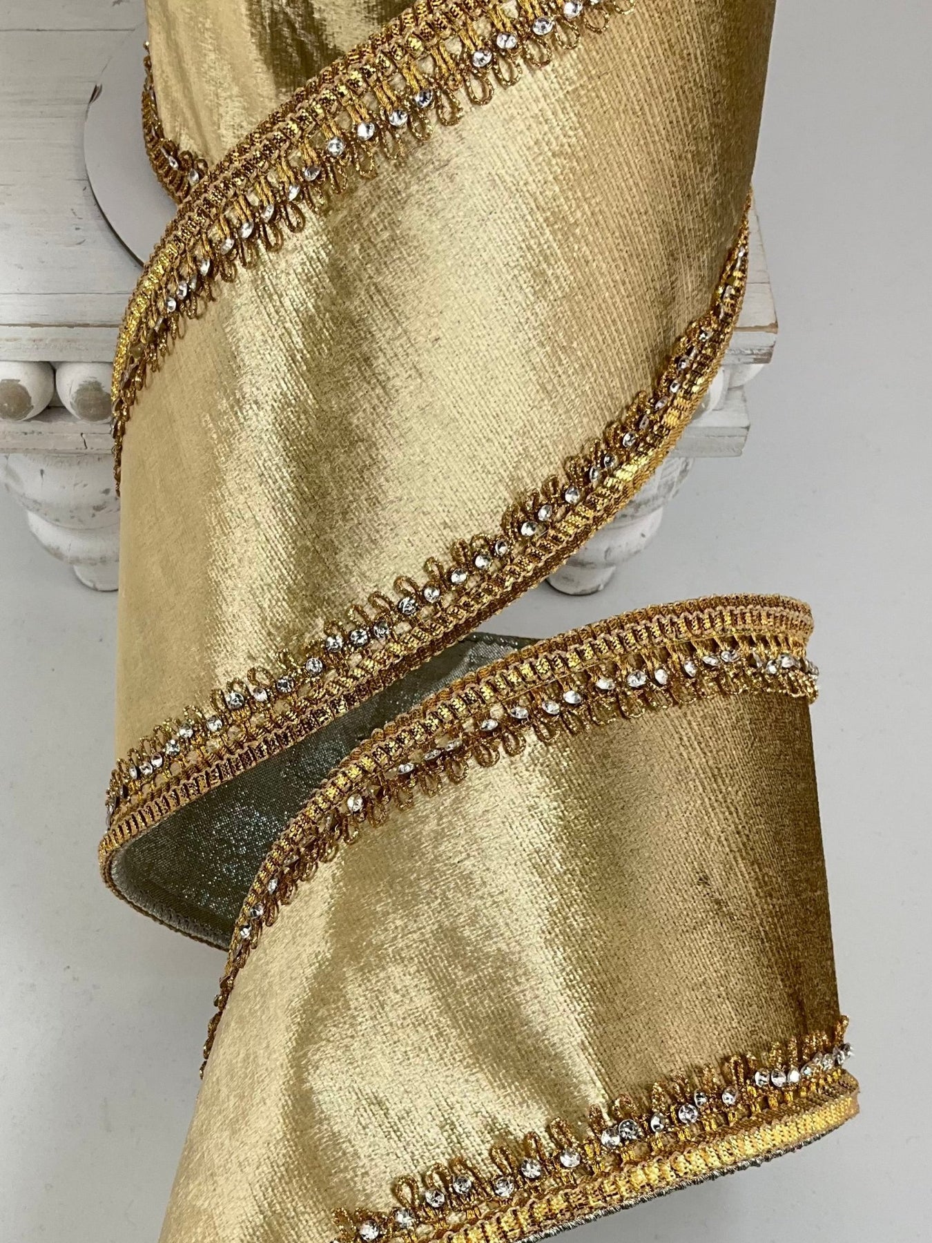 Gold Tiffany Velvet Farrisilk With Crystal Trim Wired Ribbon