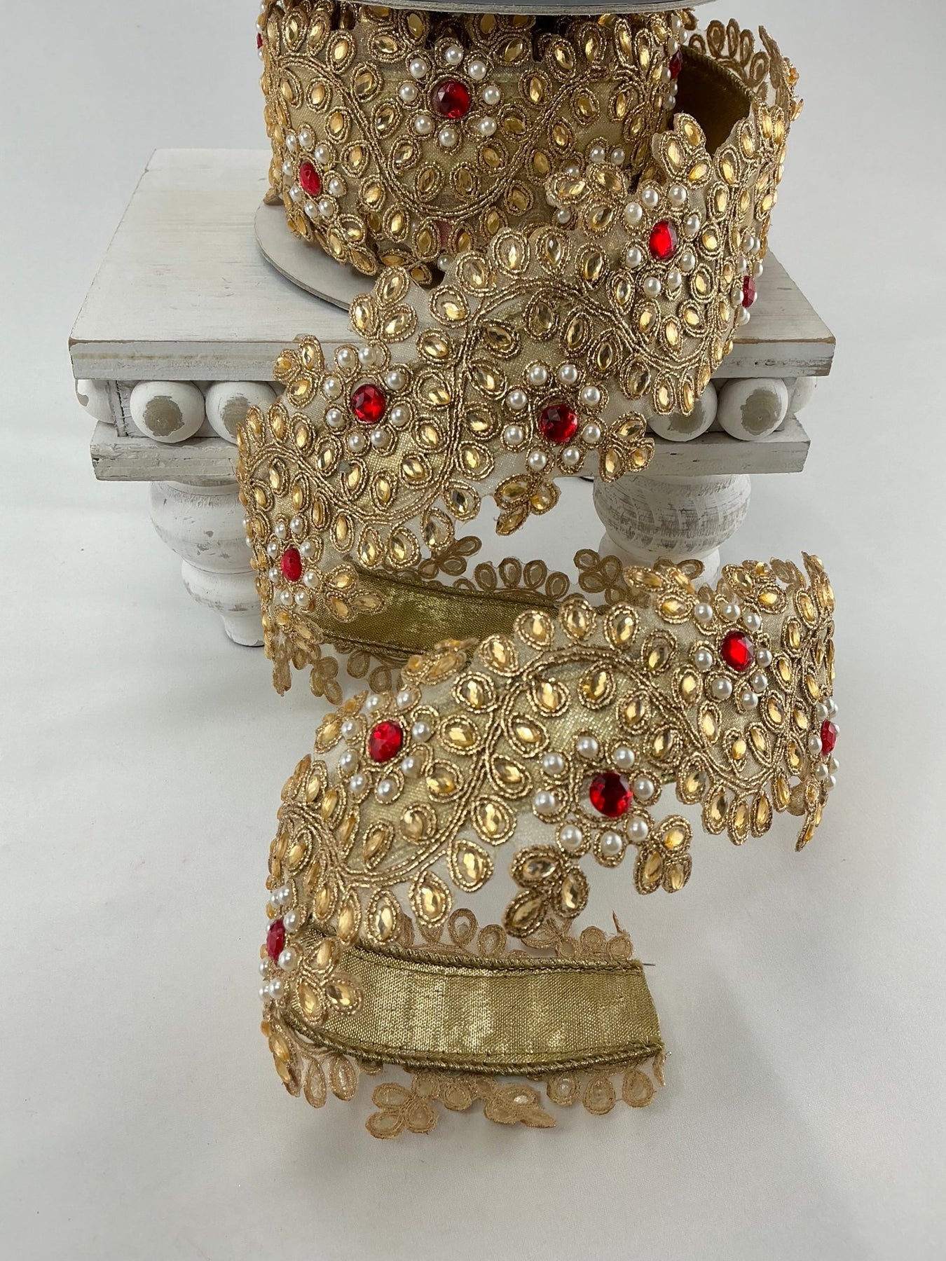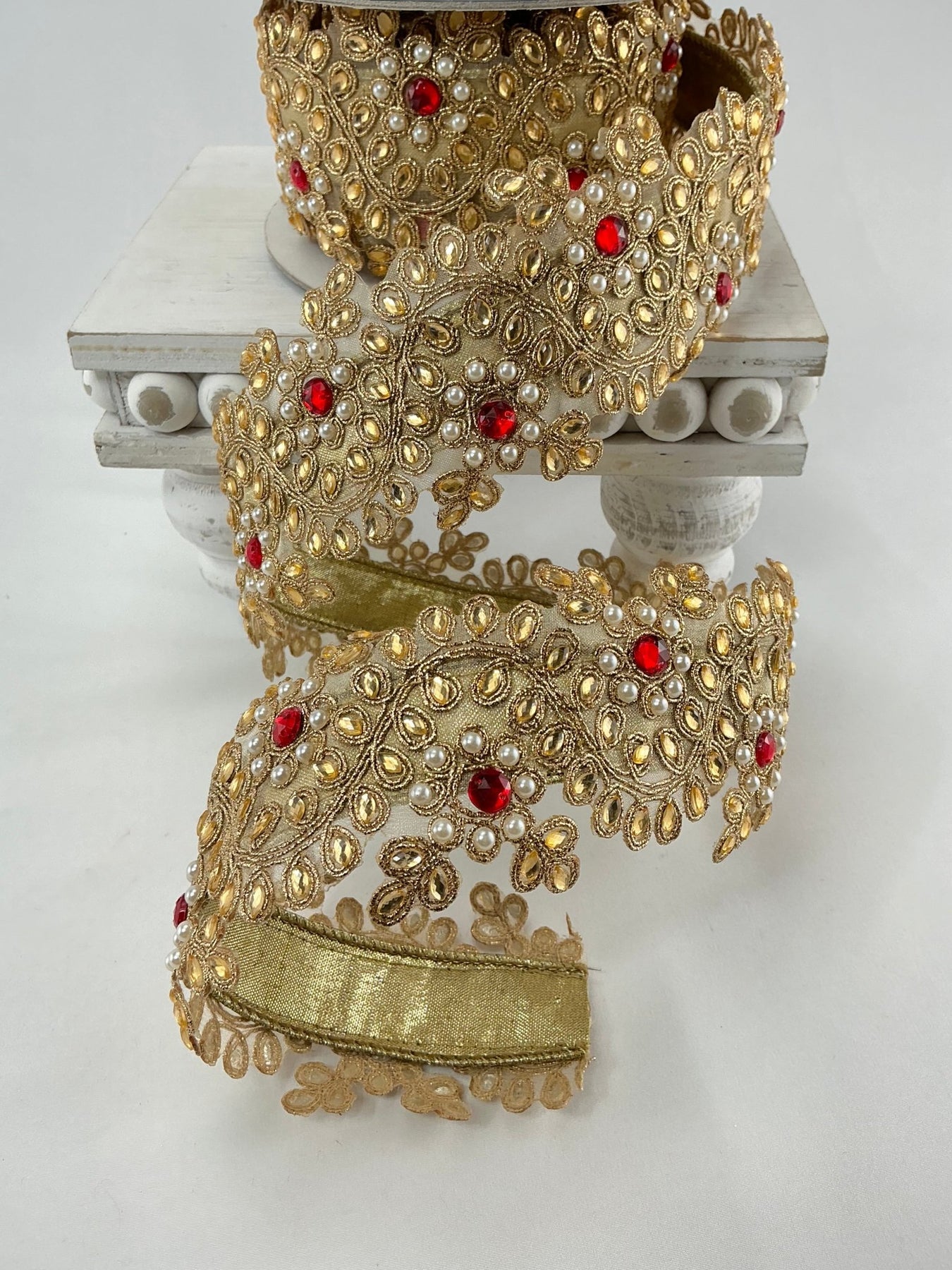 2.5” red gems and pearls wired velvet. Ribbon is constructed with thick, wired edge to provide shape and structure.