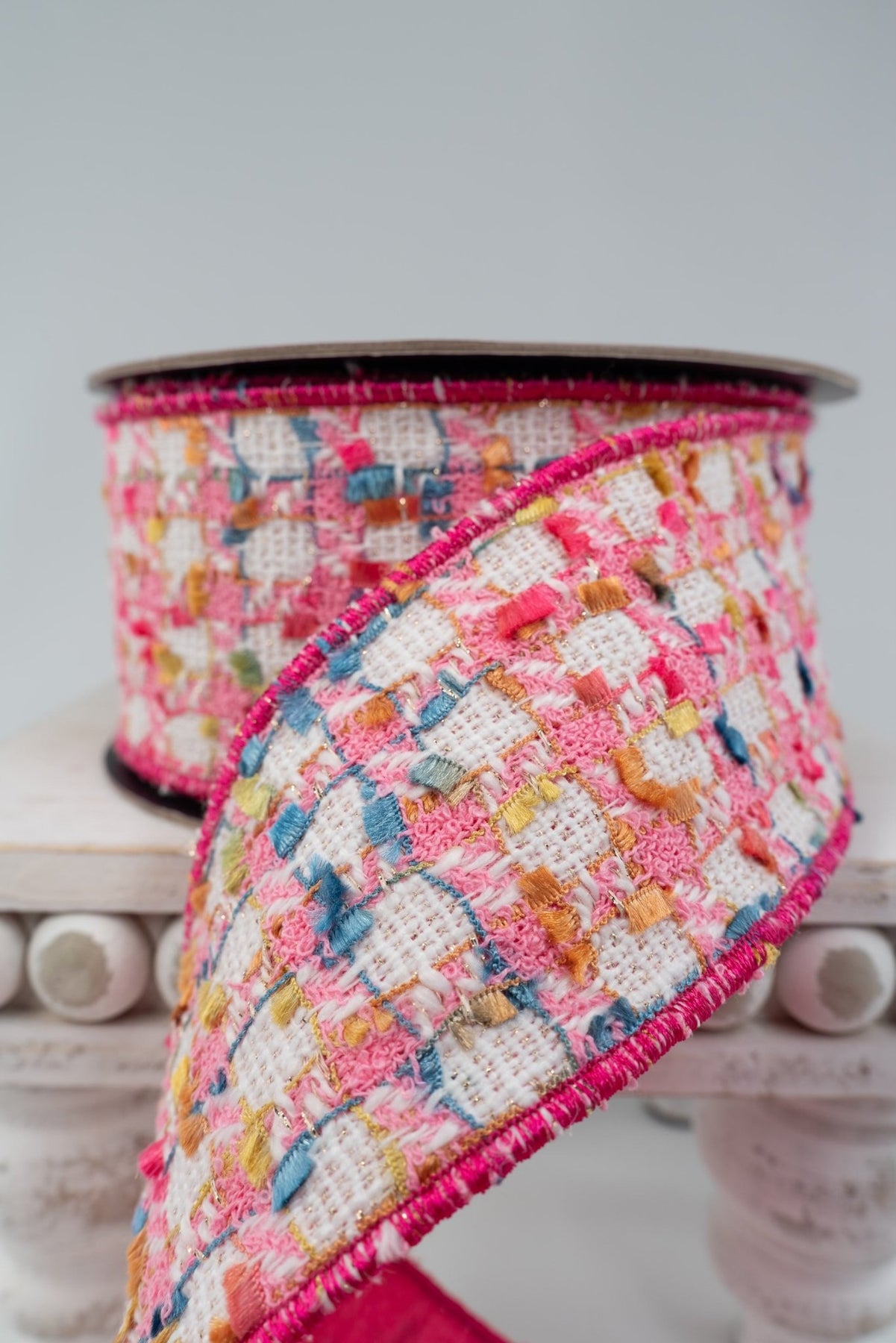Boucle Pink, Gold, & White Dupion Back Wired Ribbon