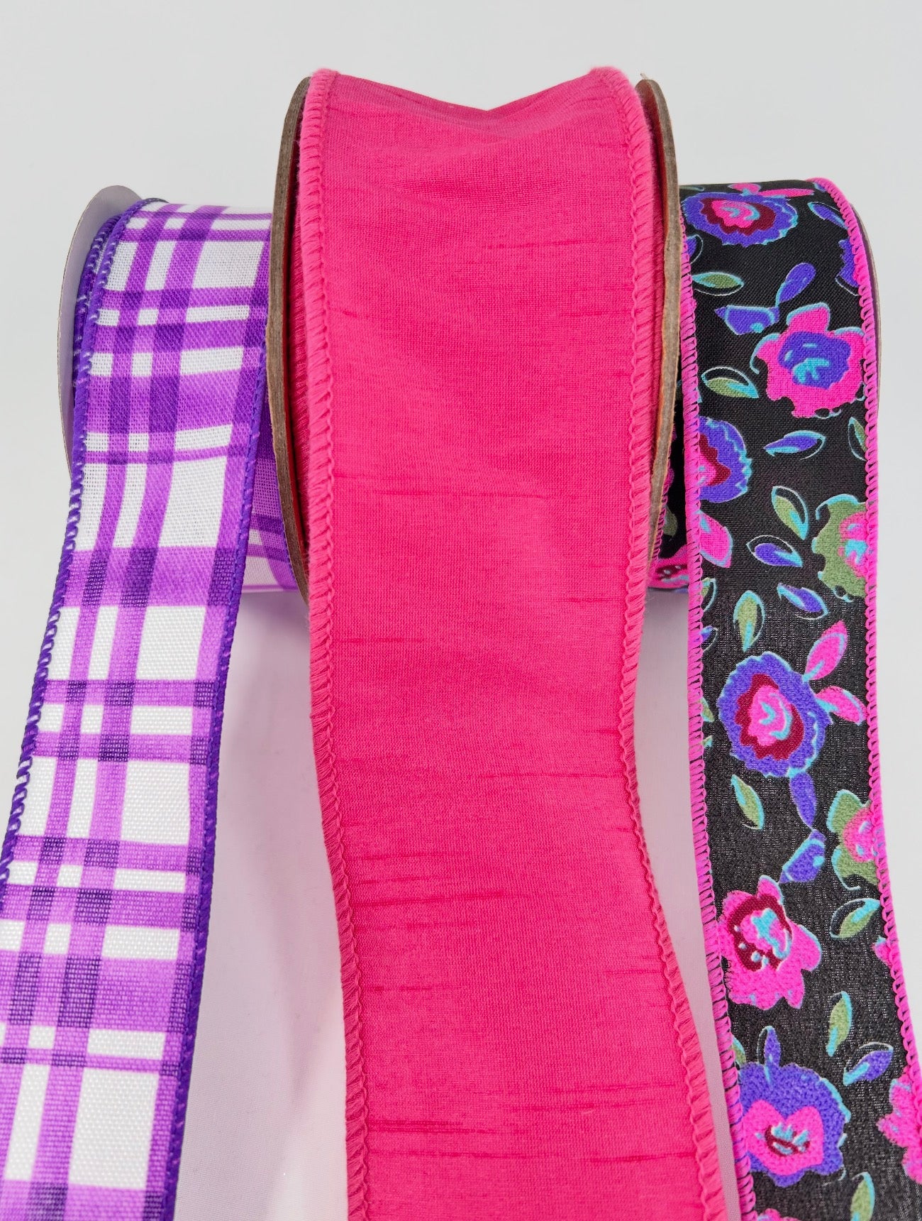3 coordinating bright pink and purple floral ribbon bundle of ribbons.