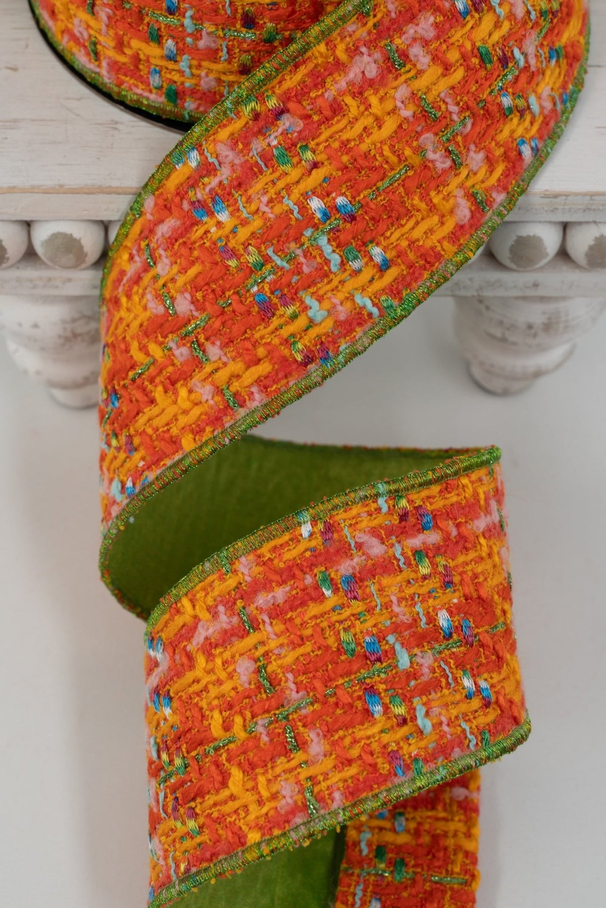 Boucle Orange, Green, & Blue Dupion Back Wired Ribbon