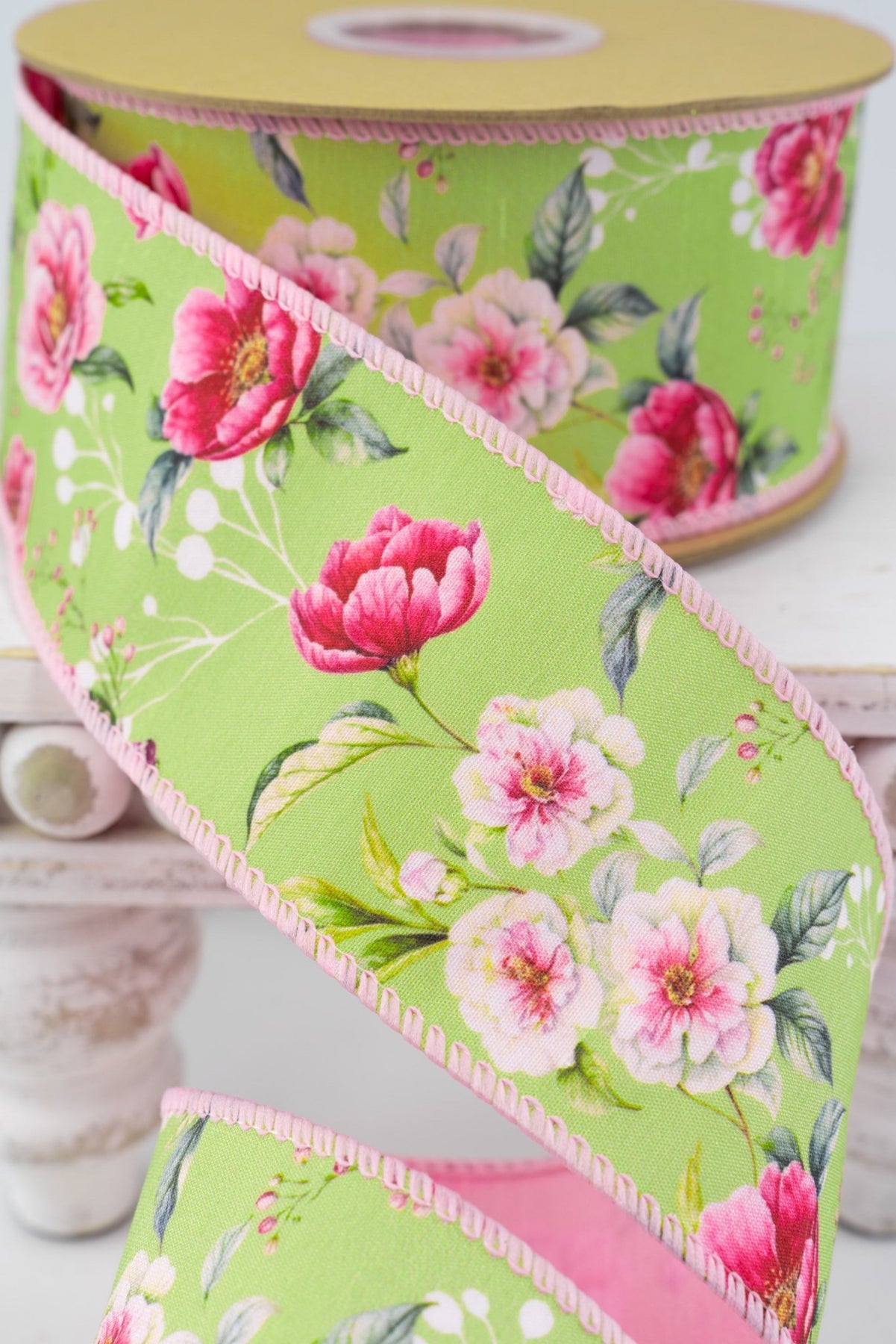 Rose Blooms On Green with Pink Backing Wired Dupioni Ribbon