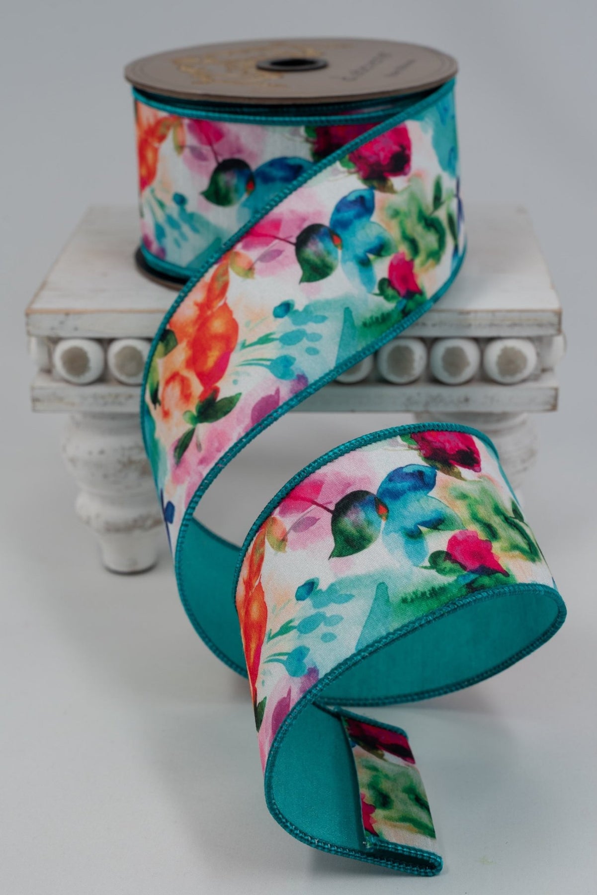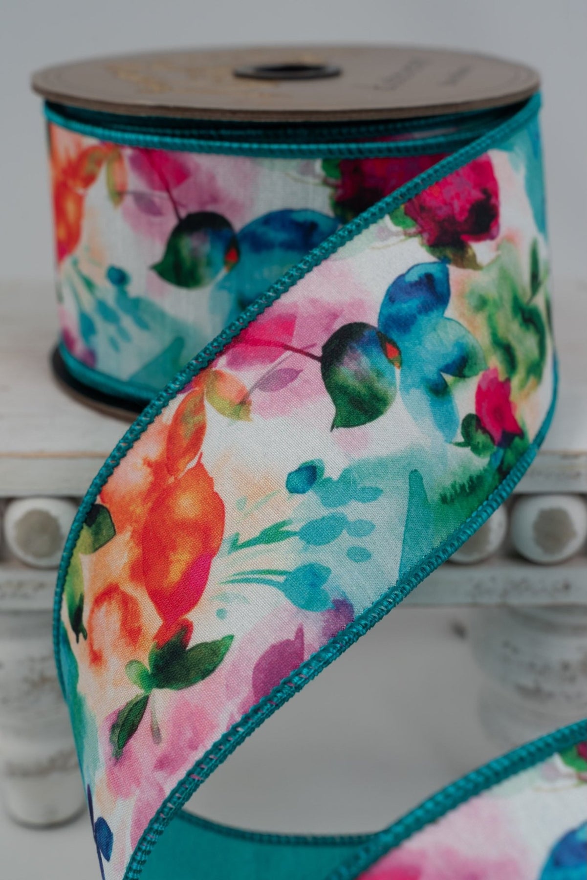 Teal, Pink, & Green Watercolor Botanical Leaves Dupion Wired Ribbon - 2.5"
