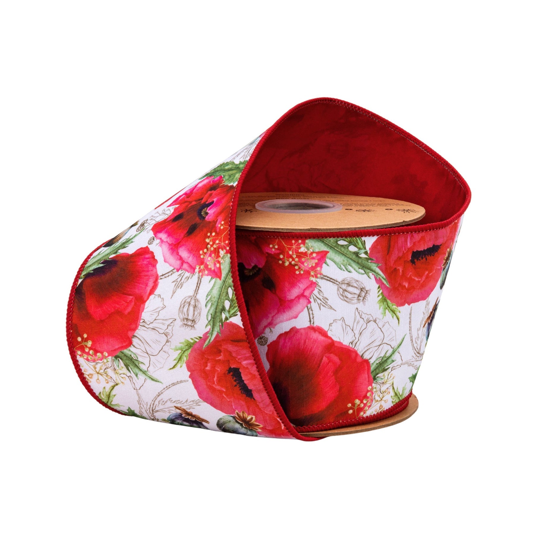 Poppies On White with Red Backing Wired Dupioni Ribbon