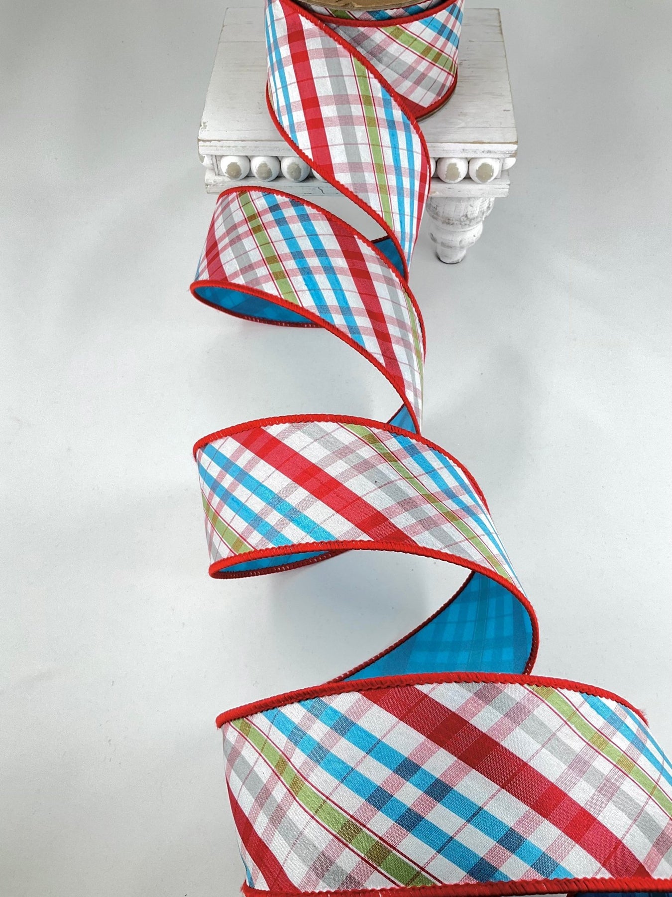2 1/2" Wired Taffeta Ribbon | Red/Turq/Apple Green/White Plaid Bias Cut w/ Turq Back | 10 Yard Roll