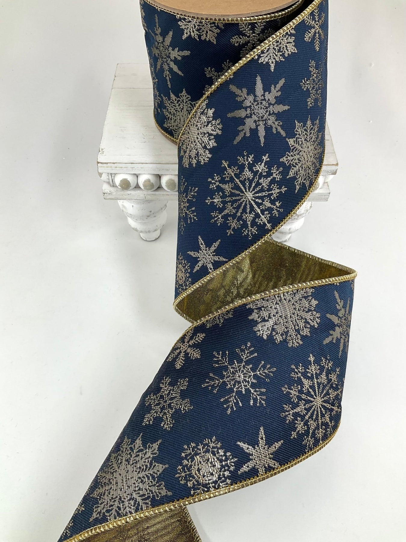 4" Wired Jaquard Ribbon | Blue Snowflake w/ Tissue Backing | 5 Yard Roll