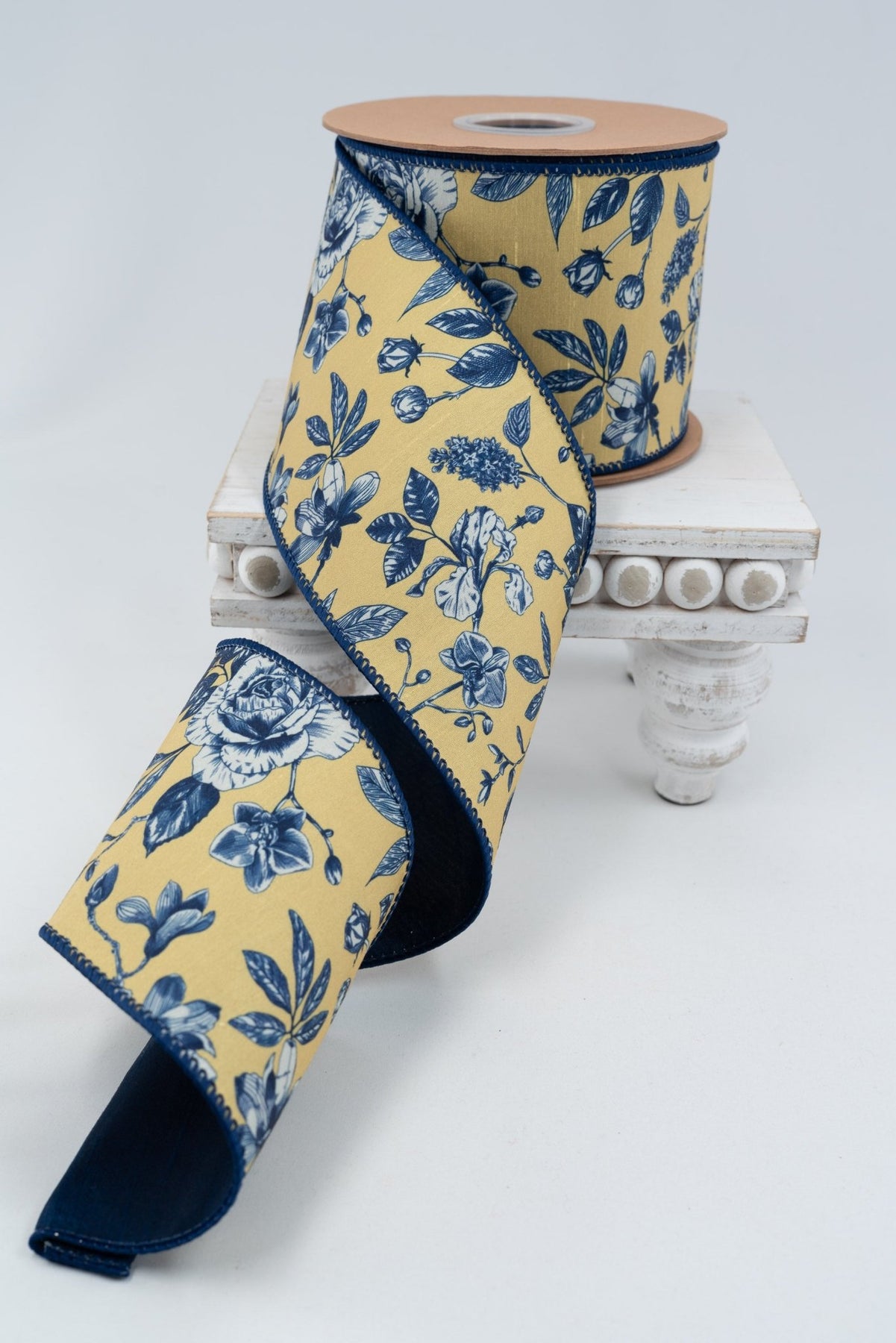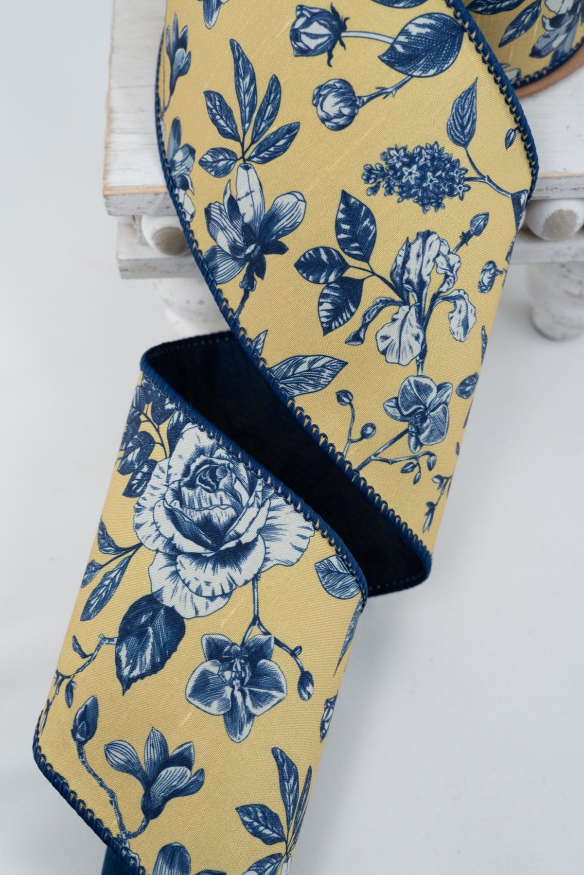 Blue & Yellow Toile with Blue Backing Wired Dupioni Ribbon - 4"