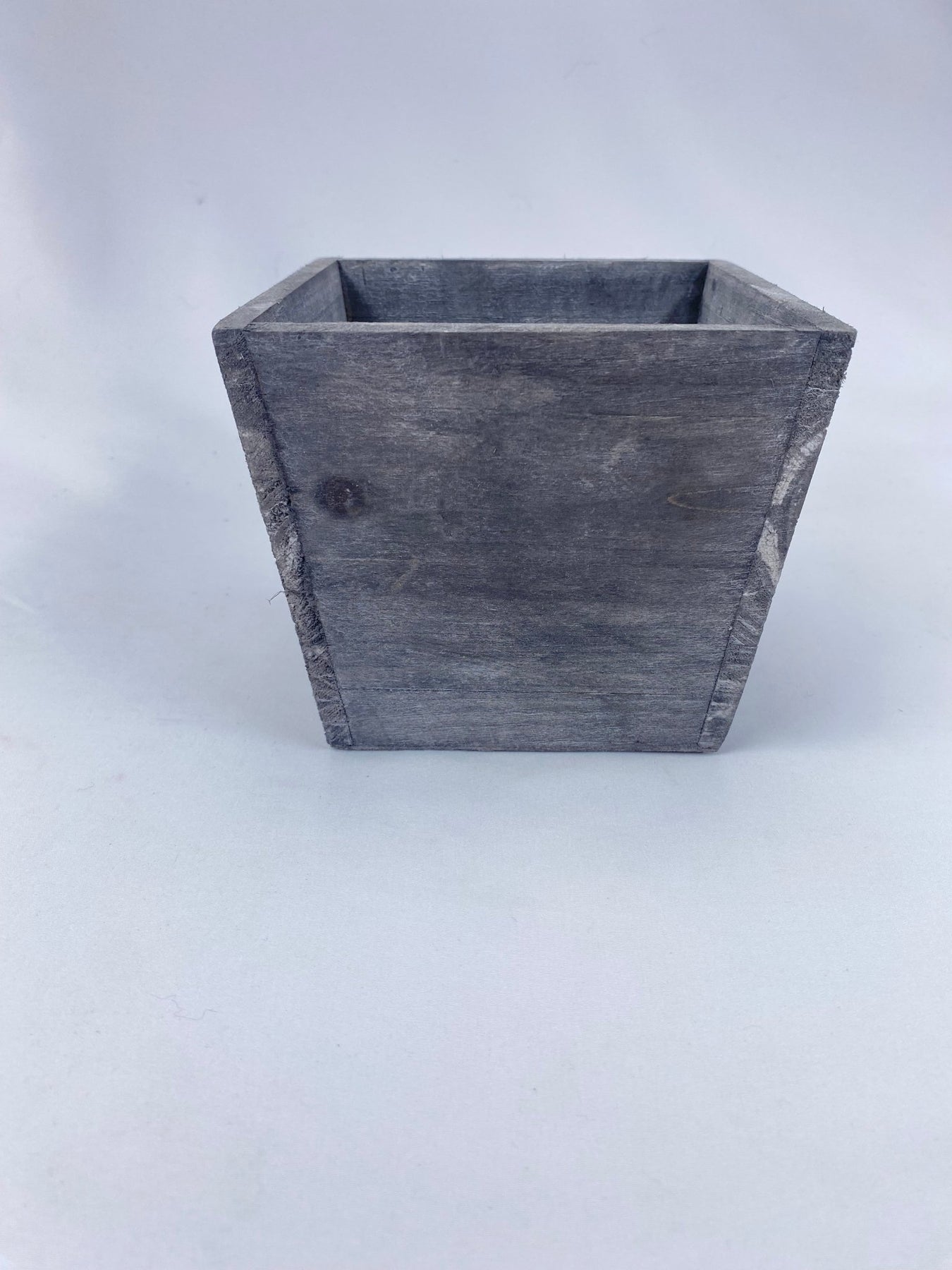 Square top wooden Gray washed container for faux flowers. Tapered base.